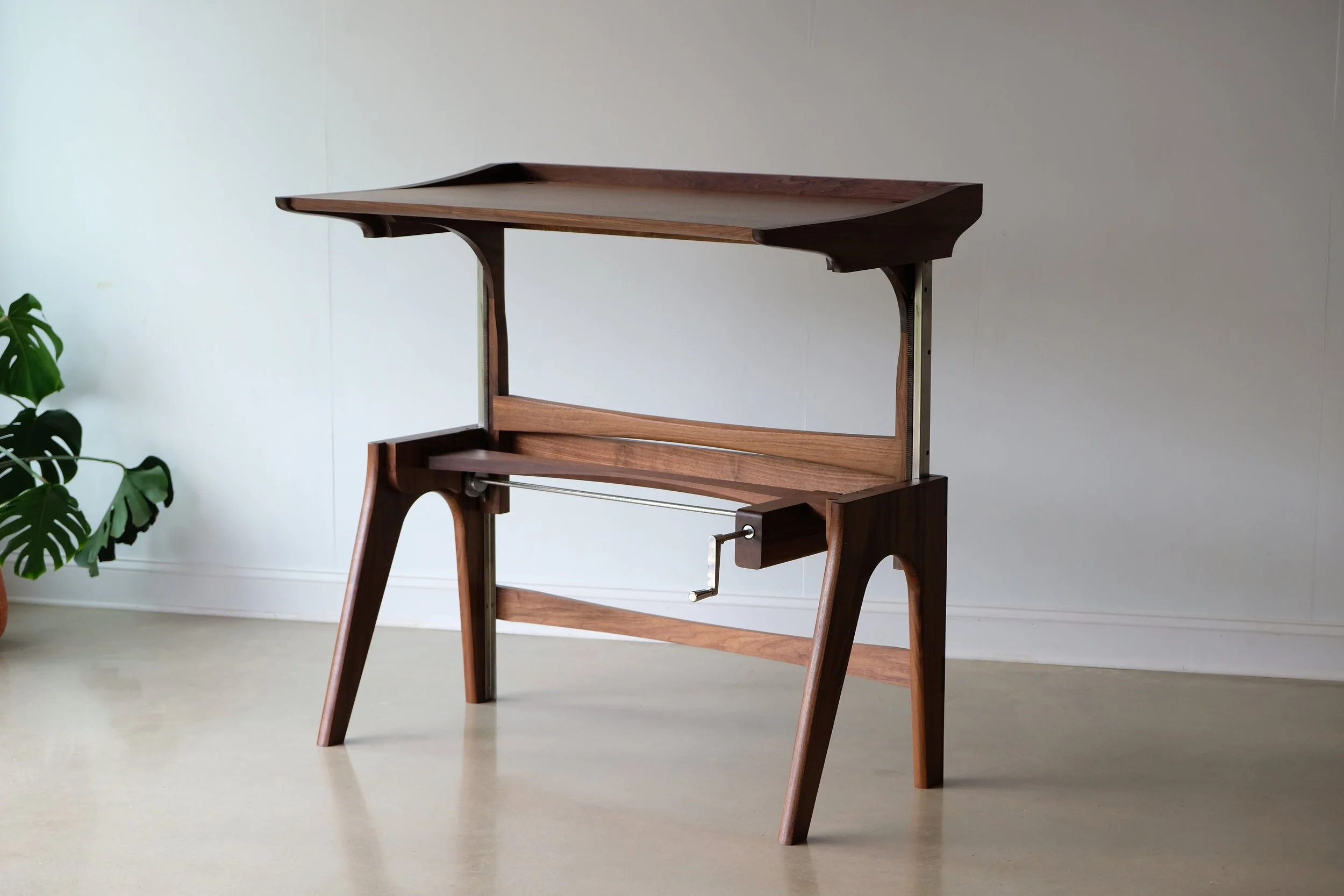 Turn the hand crank and it smoothly adjusts from sitting to standing height. No motors, no electronics to breakdown, just solid hardwood and exposed mechanical parts that you can actually see working.